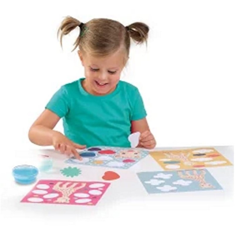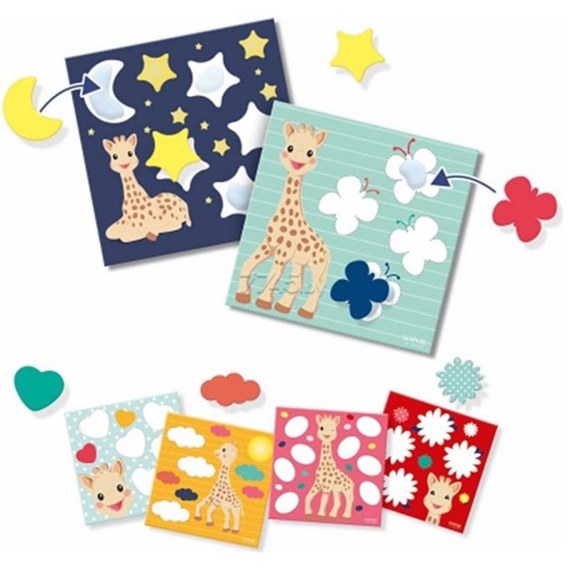 Ovaj set sadrži šest kartica Sophie la girafe koje je potrebno ispuniti oblicima u boji. Pomoću čarobnog ljepila za prste možete zalijepiti nedostajuće oblike na prava mjesta. Ljepilo za prste je plave boje, tako da možete vidjeti gdje ste stavili ljepilo. To je stvarno korisno, jer onda točno znate gdje zalijepiti dijelove. Kad se ljepilo osuši, plava boja nestaje. Vau, kao magija!