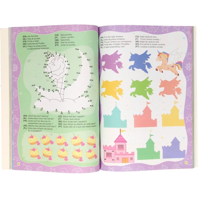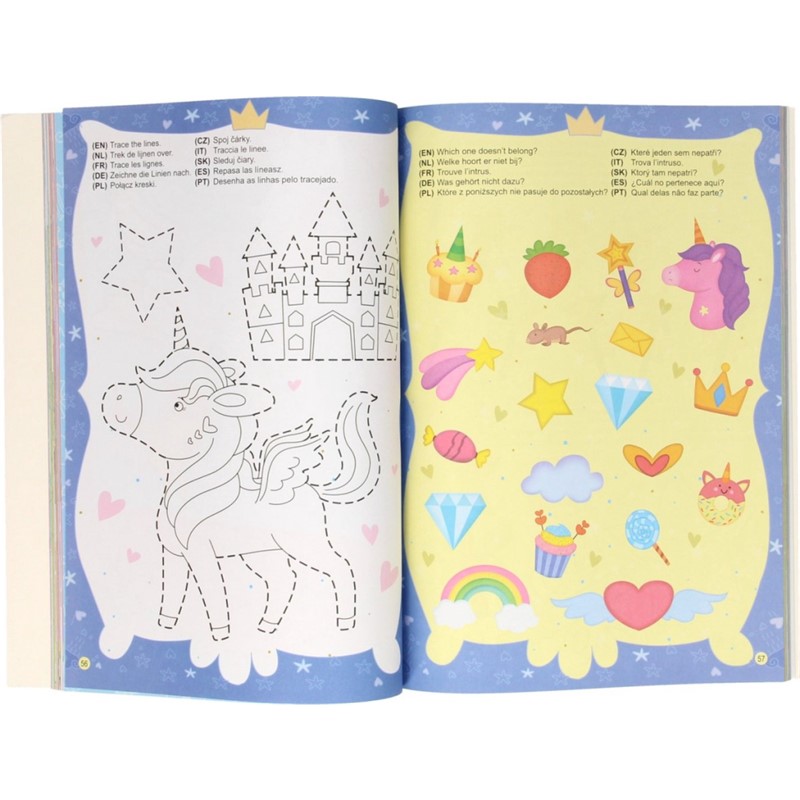 sljedeći brojeve, izrezivanje, igra labirinta i memorija te mnoštvo drugih igara ćete pronaći u ovoj fantastičnoj vježbenici koja dolazi u 3 Teme, a to su: Životinje, Jednorog i Dinosauri.